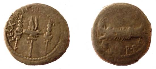 Bull/dolphin, and Galley, other side Emperor's head, see also Countermark